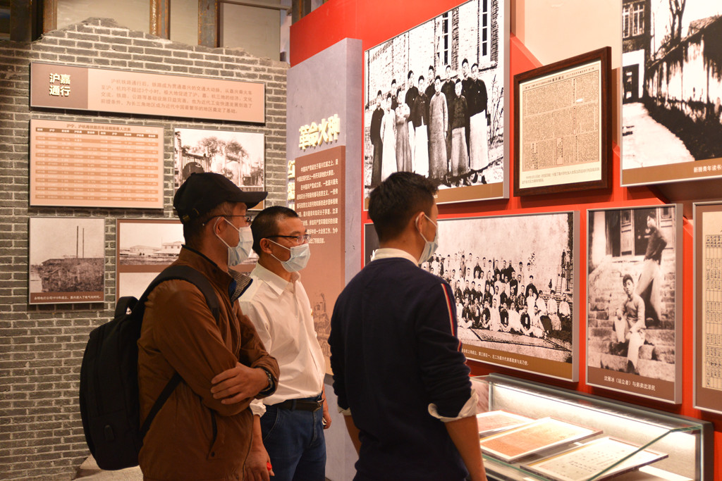 首先,党员老师们来到复建的1921年嘉兴火车站,该车站以1921年火车站站房的原始资料,按1:1的比例原风貌复建,使用了1921块“建党百年”红色纪念砖和2021块“建党百年”青色纪念砖,寓意建党百年。在复建站房内,党员老师们参观了红色主题展览,进一步了解嘉兴火车站的前世今生及嘉兴铁路枢纽的重要意义。沿着“重走一大路”引导铜线,接着来到老火车站站房。老火车站站房作为爱国主义和革命历史主题教育展馆,配有“一条铁路、一座城市”和“红船民兵先锋连”2个展厅,分别讲述了一条铁路见证嘉兴百年历史的变迁史和嘉兴人民武装的创建和发展史。