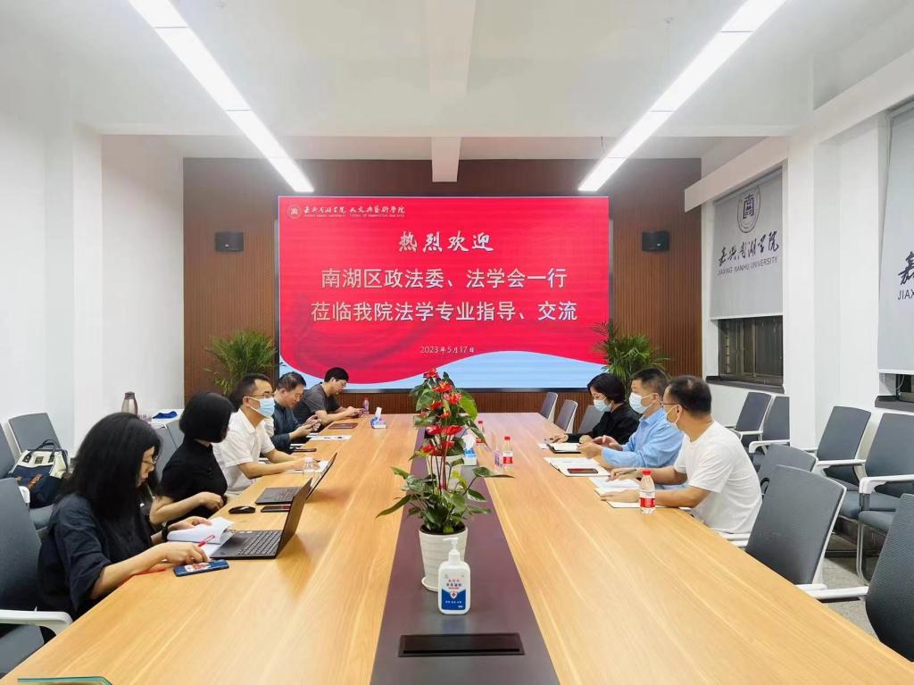5月17日下午,南湖区委政法委政治处主任袁春岚、区法学会专职副会长吴家玮一行来beat365法学专业交流指导,法学专业部分教师出席座谈。