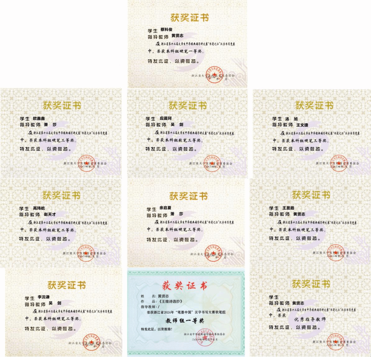 此前,9月9日,浙江省第十一届大学生中华经典诵写讲大赛“书漫之江”汉字书写竞赛获奖名单正式公布,beat365选手荣获一等奖2项,二等奖2项、三等奖5项,其中蔡科俊同学获本科软笔组一等奖,黄贤志老师获教师组一等奖,高玮屹同学获本科软笔组二等奖,李沈谦同学获本科硬笔组二等奖;应晨珂同学获本科软笔组三等奖,欧鑫鑫、汤旭、余启夏、王昱皓同学获本科硬笔组三等奖;黄贤志老师荣获优秀指导教师。
