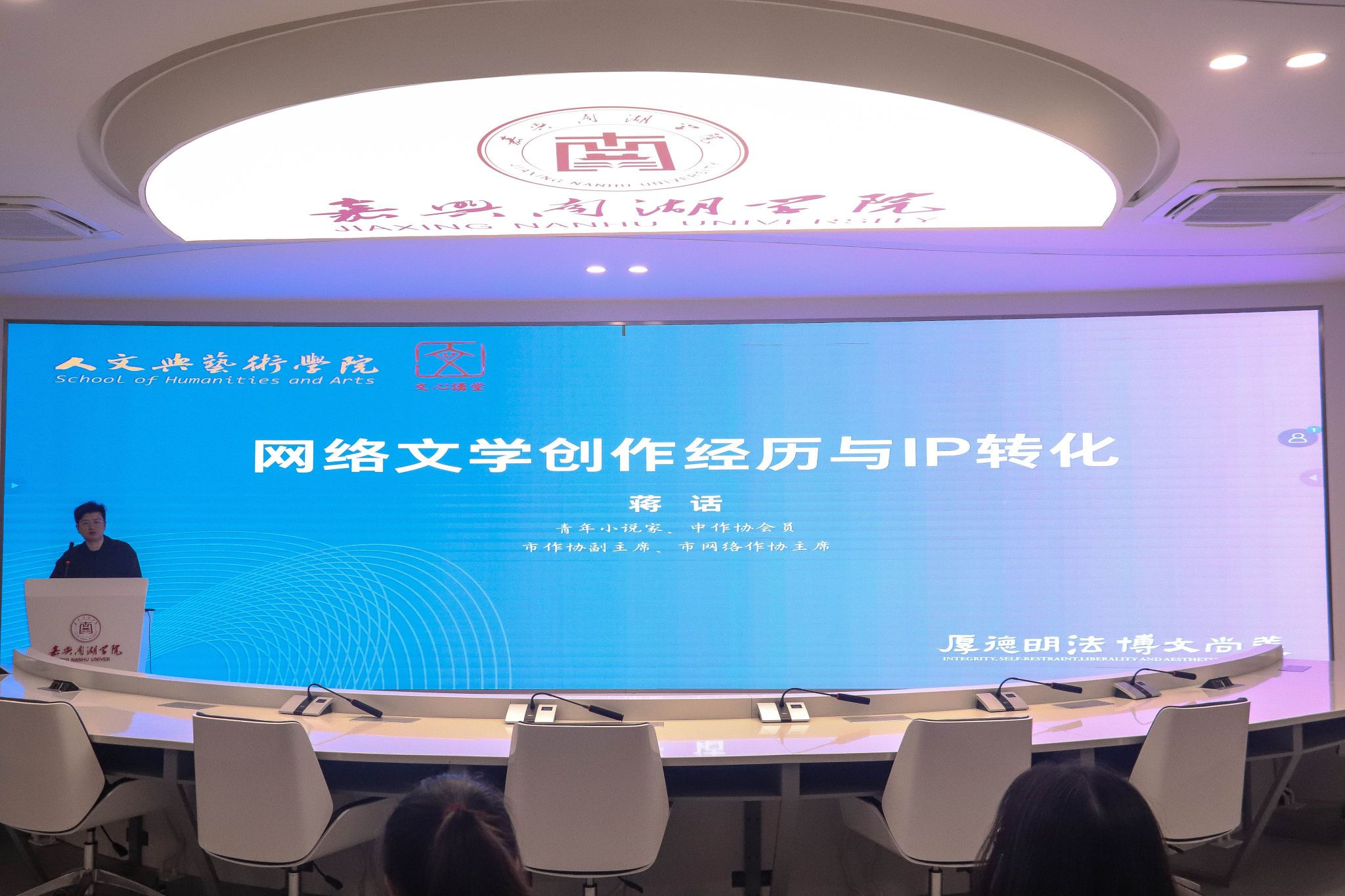 随后,嘉兴市作家协会副主席蒋话带来“文心讲堂”之《网络文学创作经历及 IP 转化》。主讲人结合自身丰富经验,分享网络文学创作技巧与 IP 转化思路,为师生带来一场文学创作与产业发展融合的知识盛宴。