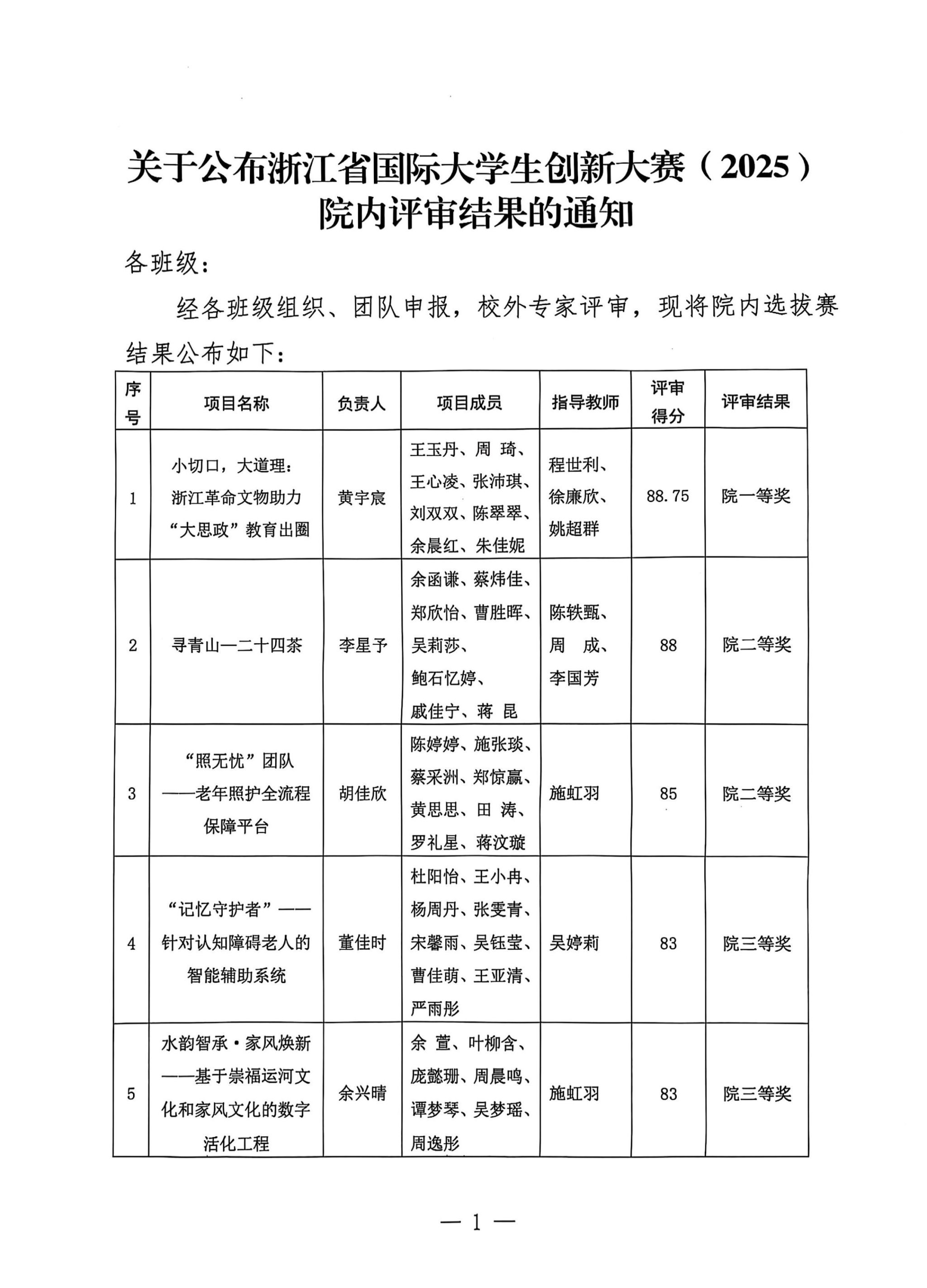 关于公布浙江省国际大学生创新大赛(2025)院内评审结果的通知