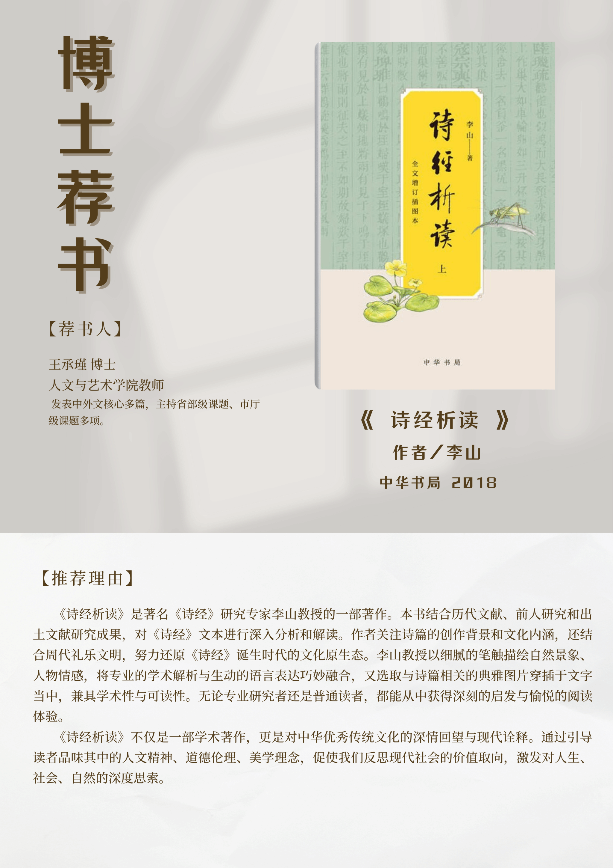 为进一步营造“书香人文”氛围,拓宽师生沟通分享渠道,现在世界读书日来临之际推出“博士读书会”活动,提供博士推荐书单(排序不分先后)供广大师生阅读。