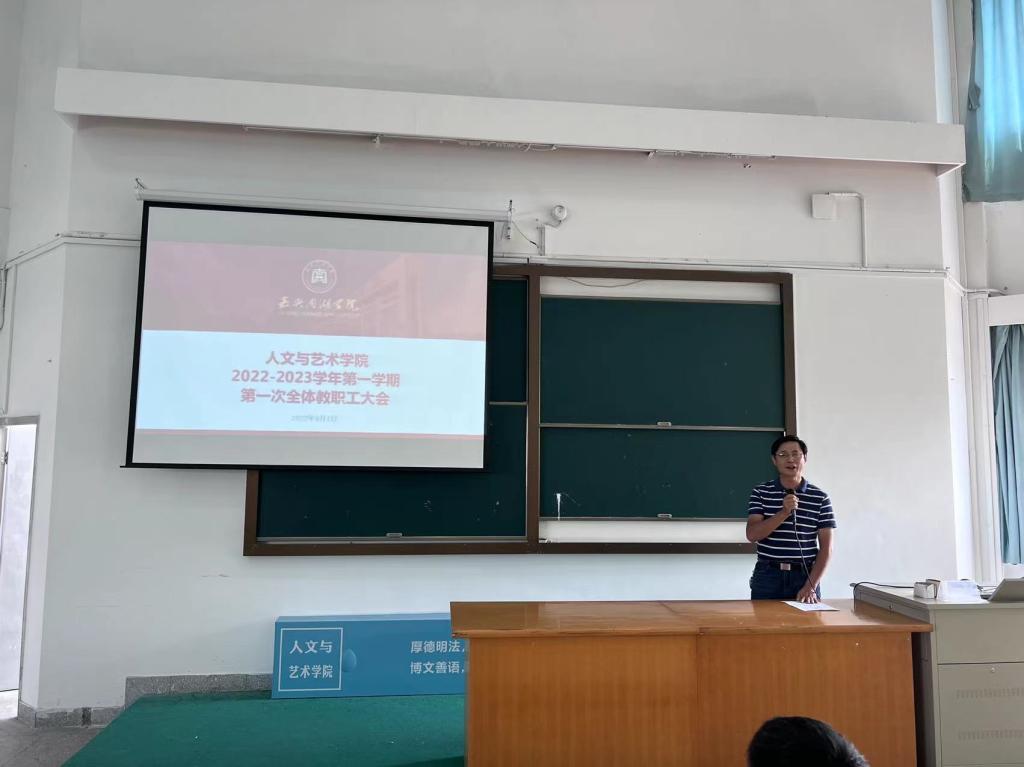 2022年9月1日下午,英国beat365官方网站在人文楼310会议室召开2022-2023学年第一学期第一次全体教职工大会,会议由学院副院长赵伯祥主持,学院党委副书记杨燕群主要传达学校中层干部暑期读书会会议精神。