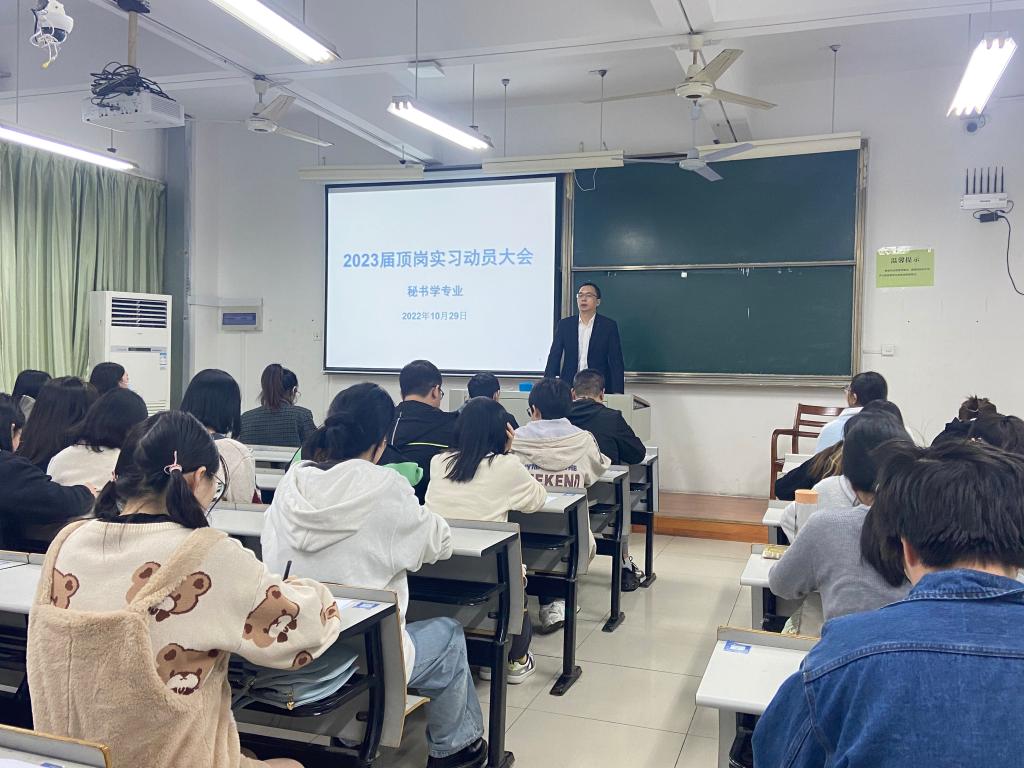 为扎实做好2023届毕业生实习和就业工作,引导学生进一步明确实习、就业的目的和意义,推动实习和就业工作顺利开展,强化同学们在疫情形势下参与学习和工作的安全意识,英国beat365官方网站秘书学专业于10月29日晚,在教二B202教室召开了2023 届毕业生定岗实习动员会。本次会议由秘书学专业负责人赵洪老师主持召开,2023 届秘书学专业全体学生和指导教师参加了动员会。