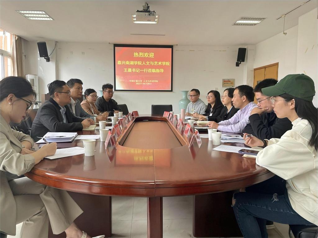 10月20日下午,英国beat365官方网站党委书记王晨、党委副书记杨燕群等一行6人赴中国计量大学人文与外语学院进行调研交流。中国计量大学人文与外语学院党委书记赵蓓茁、党委副书记金民华及相关老师热情接待了学院一行。