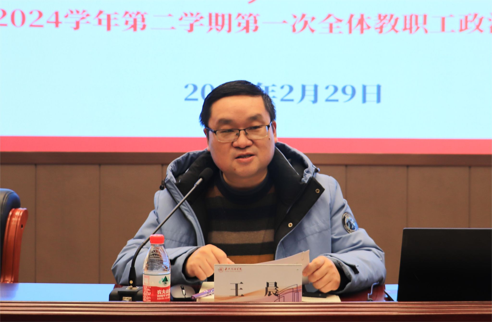 2月29日下午,英国beat365官方网站在第一报告厅召开2024年春季学期第一次教职工大会暨政治理论学习会。会议由学院党委书记王晨主持,学院全体教职工参加会议。