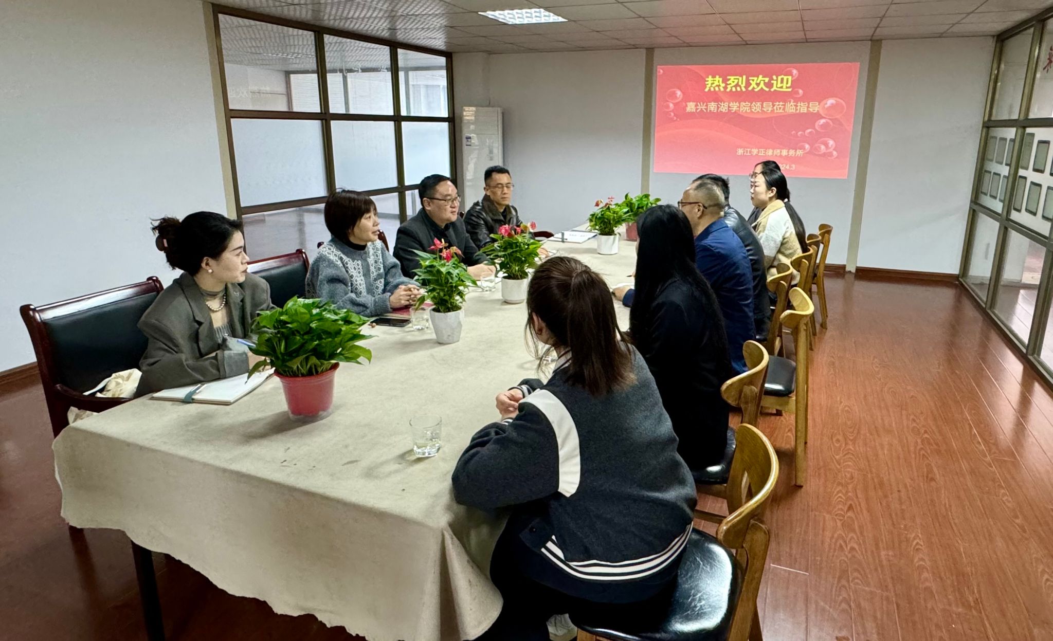 3月22日,英国beat365官方网站党委书记王晨、党委副书记罗景群、法学专业负责人郭万明、毕业班辅导员张鹤竞、赵卓均一行五人赴浙江学正律师事务所开展访企拓岗促就业专项活动。浙江学正律师事务所主任屠祖良热情接待了学院一行。