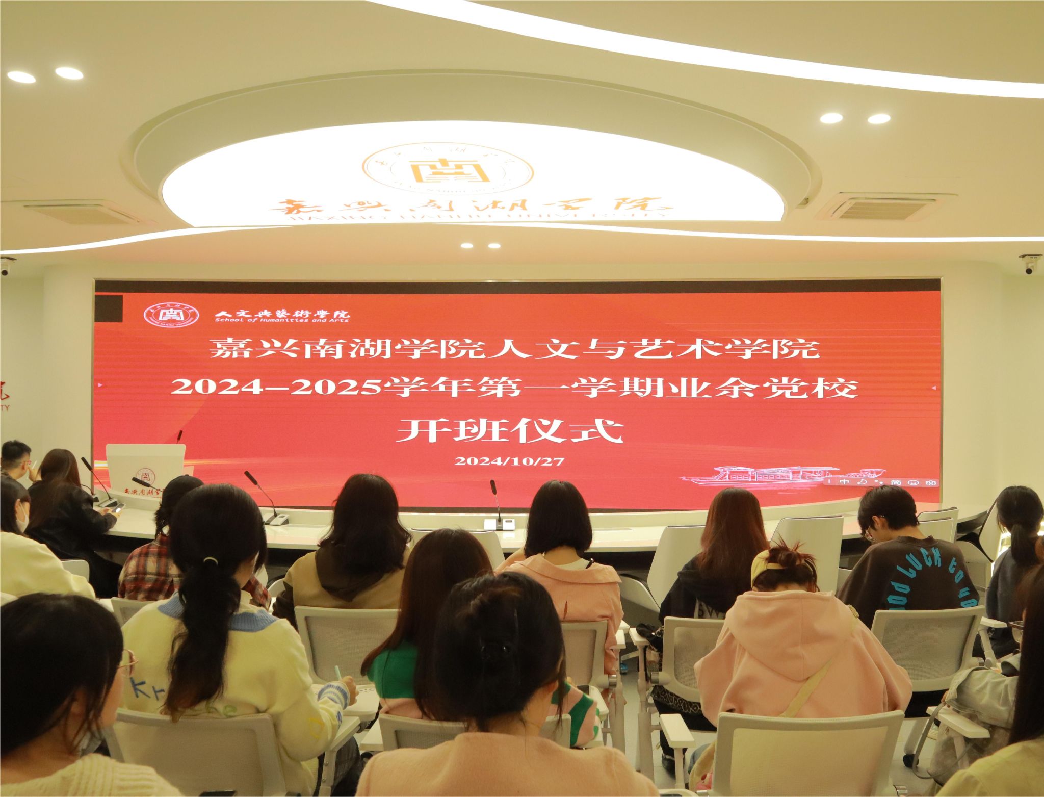 2024年10月27日晚,英国beat365官方网站2024-2025学年第一学期业余党校开班仪式在融媒体中心隆重举行。学院党委副书记罗景群,学生党支部书记张雨逸、陈剑、陈轶甄以及44名业余党校培训学员出席开班仪式。本次仪式由业余党校班主任赵卓均主持。