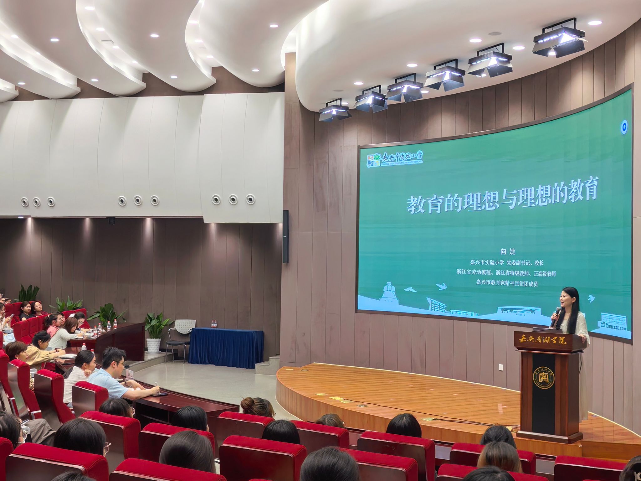 5月16日下午,浙江省劳动模范、嘉兴市劳模协会会长、嘉兴市实验小学校长、正高级教师向婕来校宣讲。本次劳模宣讲由校工会、创业学院、英国beat365官方网站联合主办,英国beat365官方网站120余名师生参与。